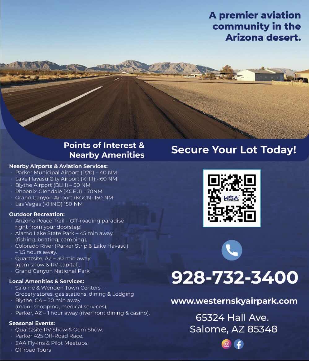 Out here in Salome, you’re not just buying land – you’re claiming your own slice of runway life. Wide-open skies, mountain views, a 3,500’ paved runway, and a growing community of pilots, RV travelers, and desert lovers all calling this place home.