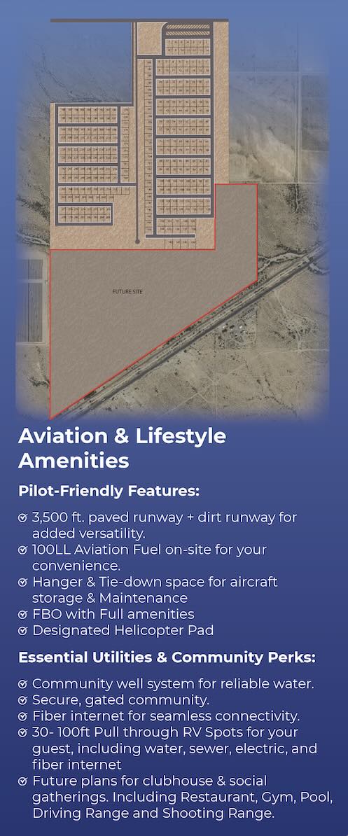 Out here in Salome, you’re not just buying land – you’re claiming your own slice of runway life. Wide-open skies, mountain views, a 3,500’ paved runway, and a growing community of pilots, RV travelers, and desert lovers all calling this place home.